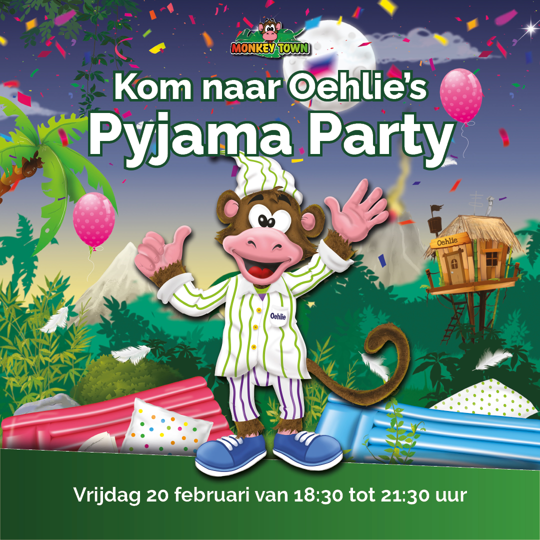 In Hardenberg is op vrijdag 20 februari 2026 de unieke kans om Monkey Town in de avond te bezoeken... en een te gek feest te bouwen! Kom jij ook naar Oehlie's Pyjama Party?!